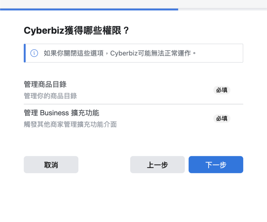 這邊主要是要徵求您的同意,讓CYBERBIZ可以協助您快速將 EC 的資料與 Facebook 的資料做連結,並不會影響到您目前 Facebook 企業管理平台的操作。