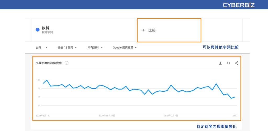 除了GSC之外,Google trends也是一個簡單易懂又好用的關鍵字規劃工具。主要可以顯示出Google搜尋中的熱門話題,藉由此工具我們可以確認目標受眾想要找什麼,並可以看見特定時間內搜索量變化的曲線。