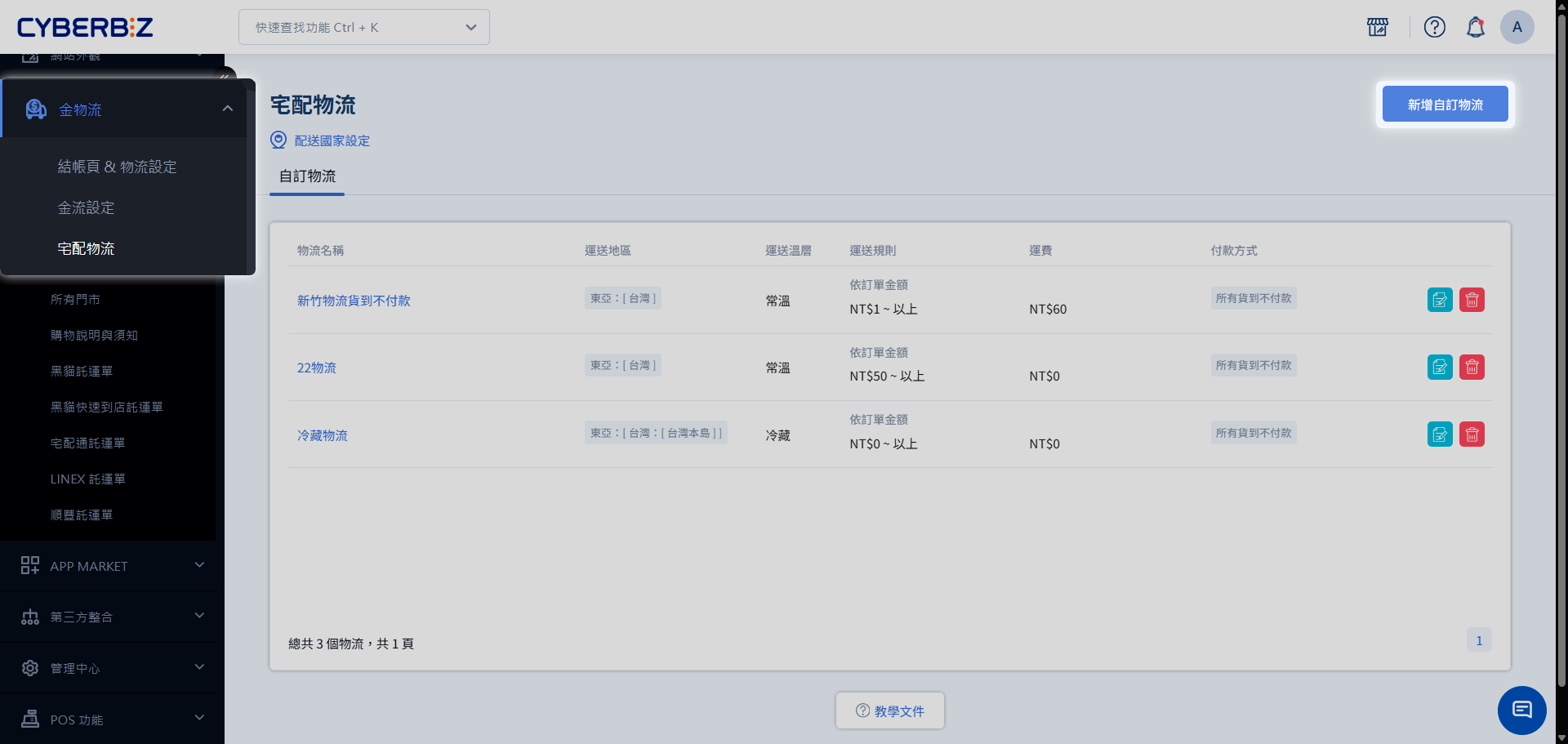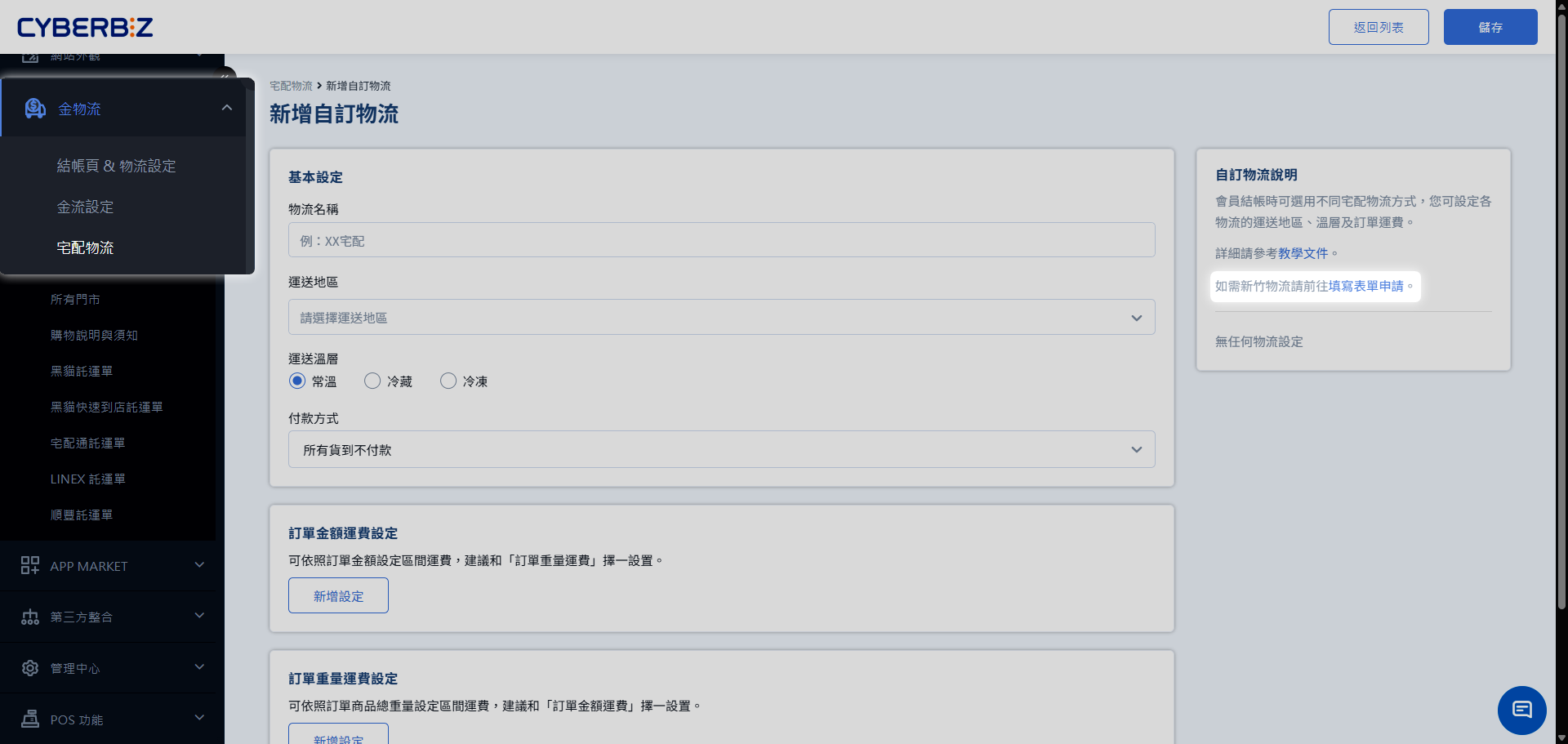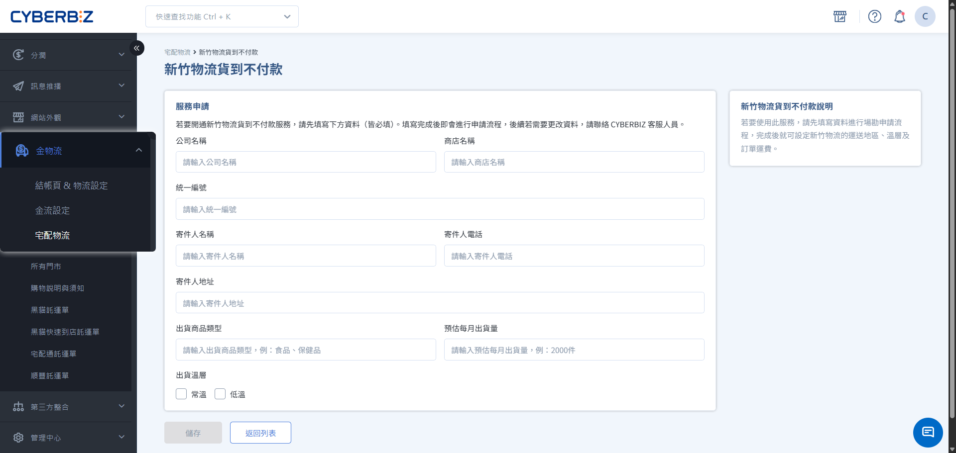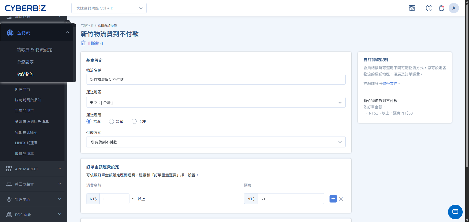 - 串接物流分頁為必須透過 CYBERBIZ 配合的物流,目前適用黑貓/宅配通/新竹物流貨到付款。