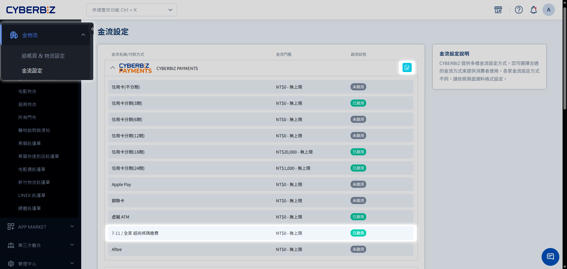 於「CYBERBIZ PAYMENTS」金流選項,點擊「編輯」,開啟「7-11 / 全家 超商條碼繳費」。