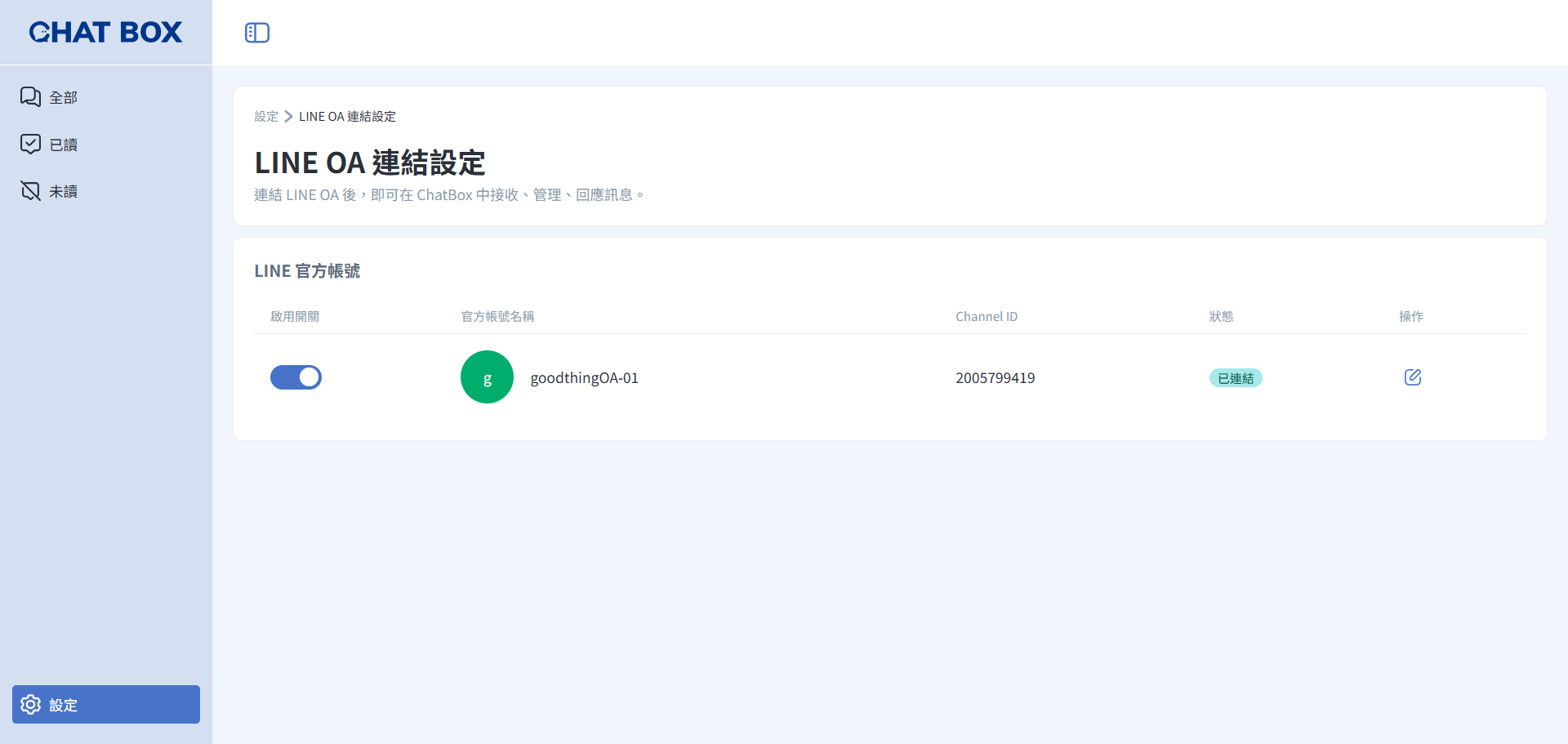 Chat Box 訊息通 將自動導入您於 「第三方整合」→ 「LINE OA 設定」 中所綁定的官方帳號。