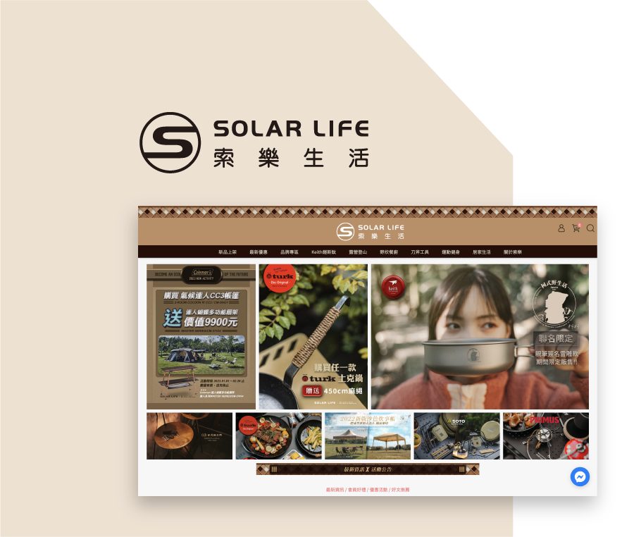 從事電商銷售二十餘年,創立索樂生活戶外用品品牌,代理、經銷國內外的露營登山用品、野炊餐具以及居家生活用品,並且成為鎧斯Keith鈦的台灣總代理商,販售純鈦製品。2018年透過CYBERBIZ建立品牌官網,運用多元的行銷工具、互動遊戲,帶動整體業績30%!