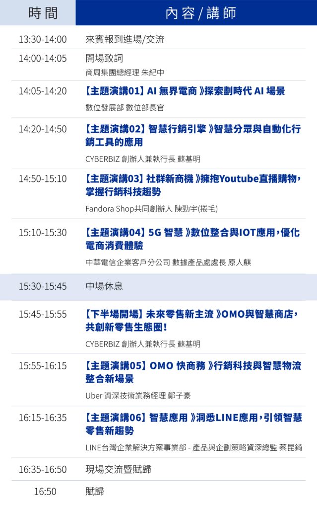 CYBERBIZ 與《商業周刊》攜手,今年舉辦實戰力最強的電商高峰論壇,探討電商發展方向和創新應用。包含自動化行銷、虛實整合,以及跨境電商等新零售趨勢,邀您一起進入OMO電子商務的大未來!