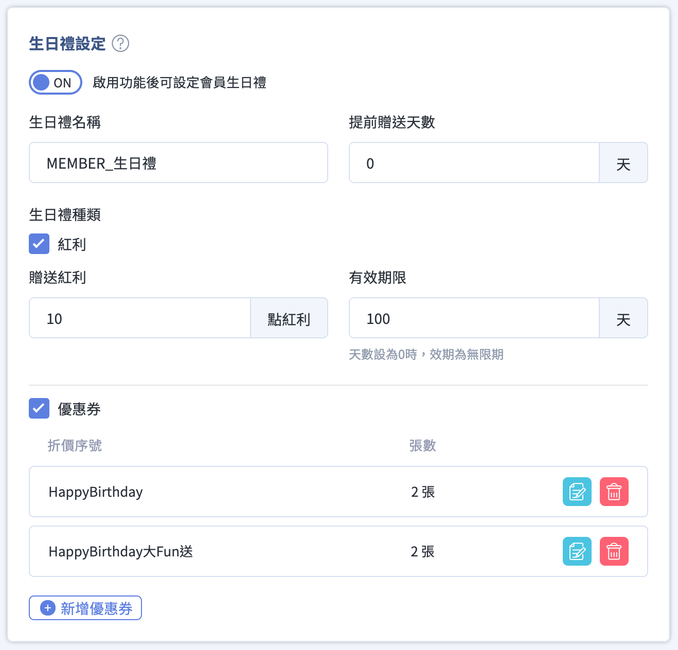 - 您若於 「行銷活動」→「全館折扣-紅利&優惠券」 設定生日禮贈送規則,消費者下單後,將同時獲得全館生日禮與 VIP 生日禮,請謹慎規劃 VIP 生日禮發放政策。