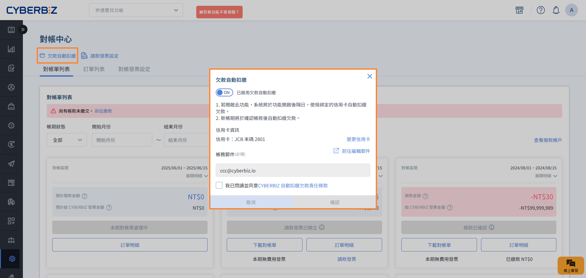- 進入對帳中心,點擊「請款發票設定」,啟用請款發票。