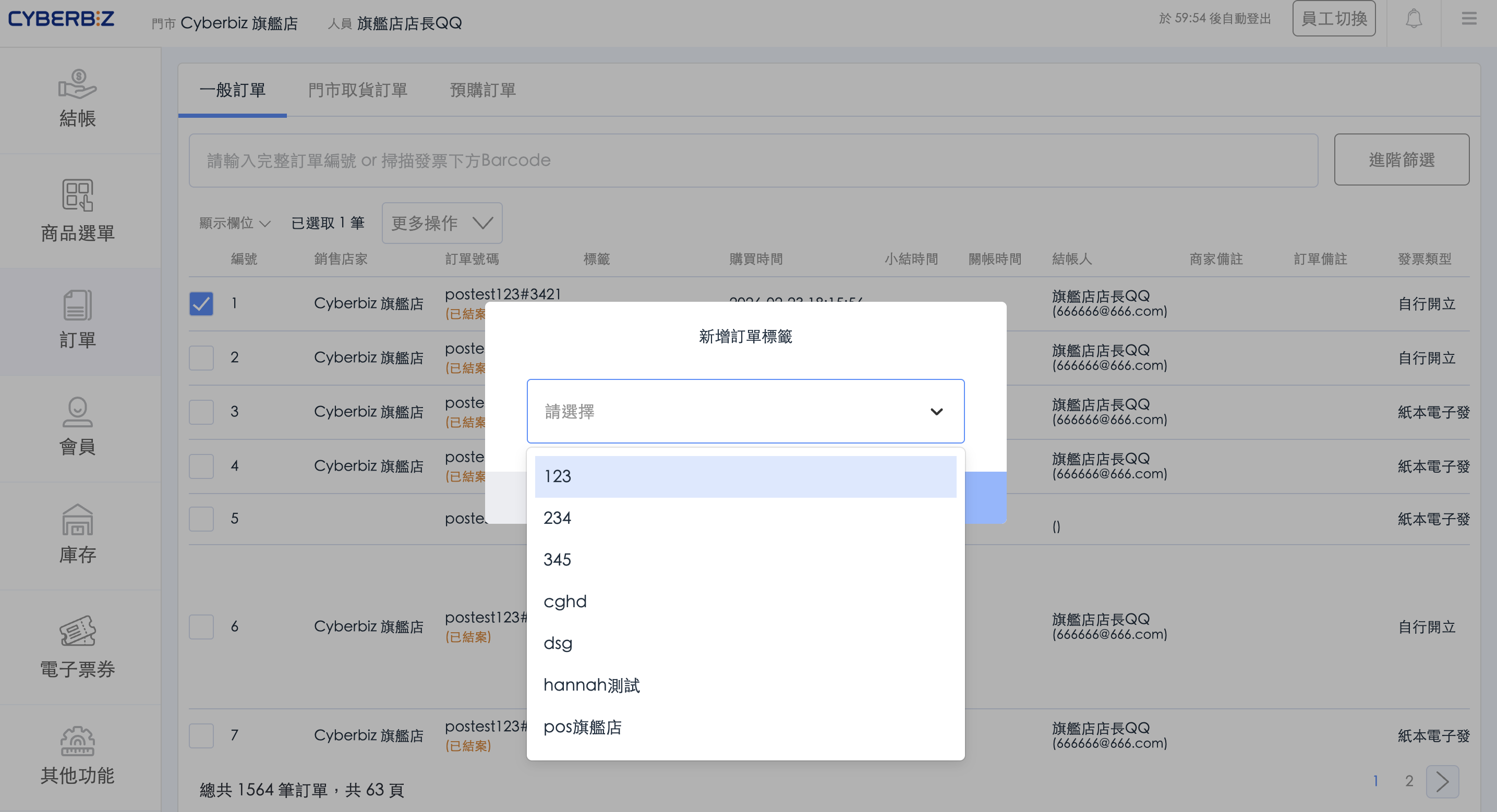 - 系統不支援於此處建立新的訂單標籤,若想建立新的訂單標籤,請前往 EC 後台,於 「訂單」→ 「所有訂單」 新增。