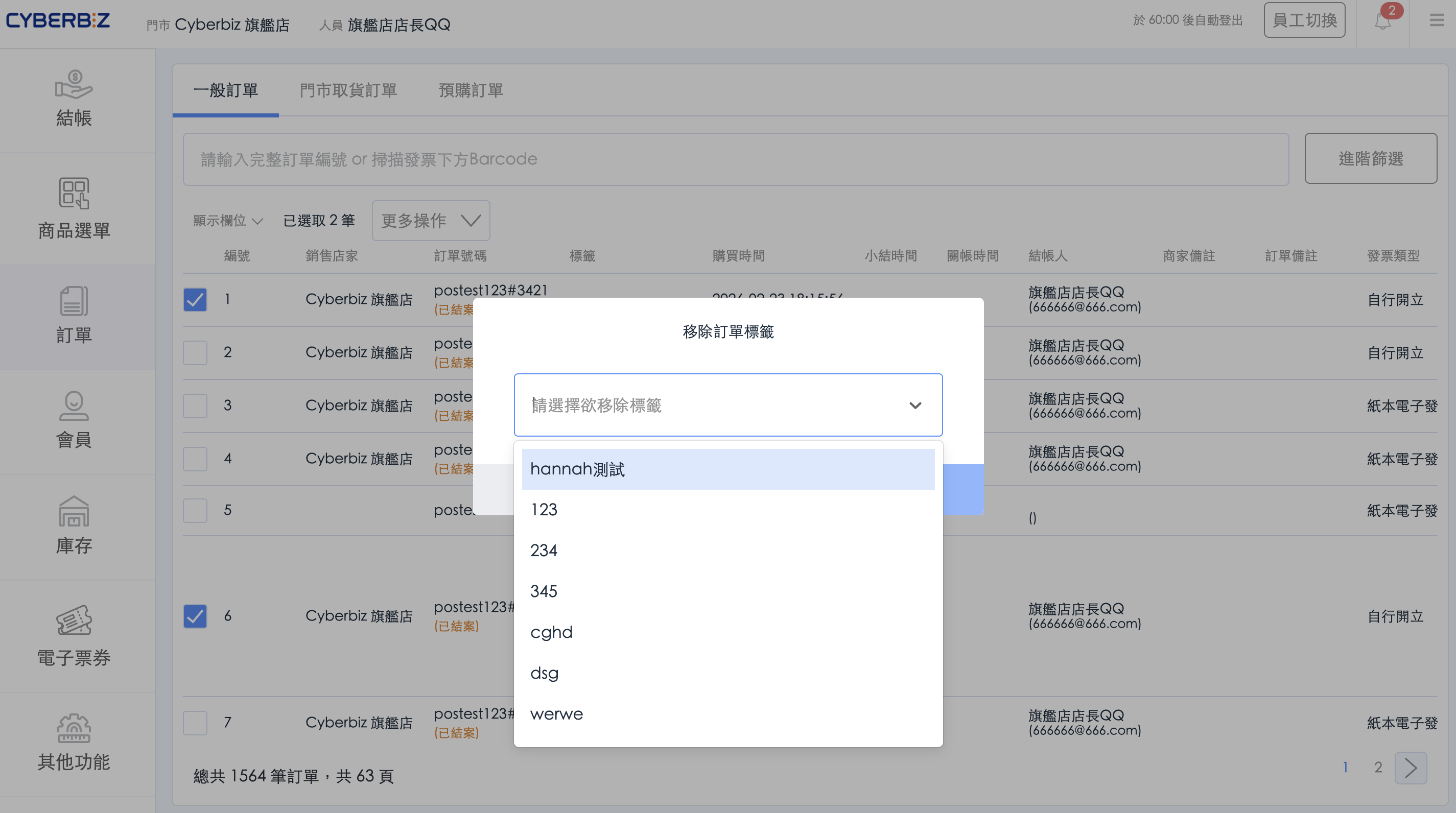 - 勾選訂單前方方框,點擊「新增標籤」/「移除標籤」,為該訂單貼上或移除標籤。