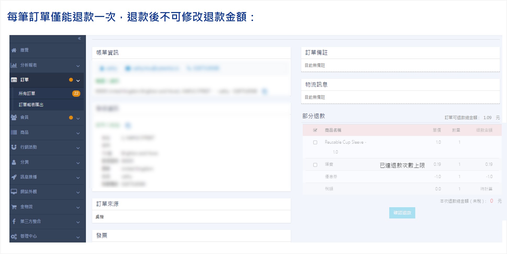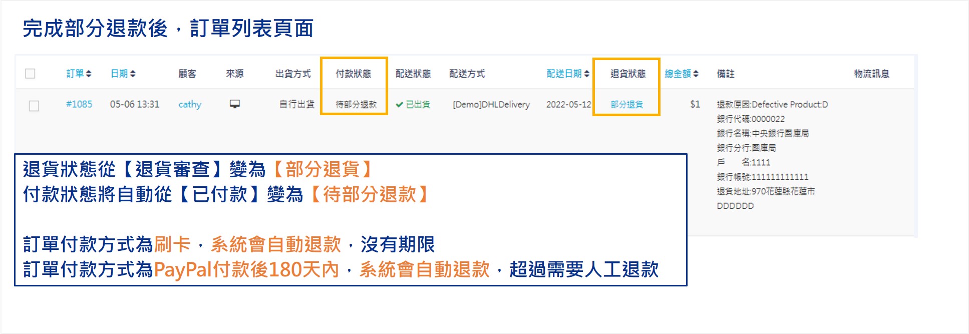 請留意:消費者付款完的隔日才能操作部分退貨。 - 確認後,訂單的付款狀態會變為待部分退款,若是使用刷卡付款系統會自動退款,若使用PayPal付款,在付款時間180天內都會自動退款。