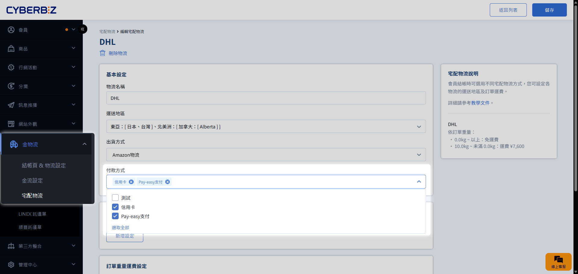 - 物流設定教學可參考 DHL 物流開通設定 及 AMAZON FBA 物流設定 設定。