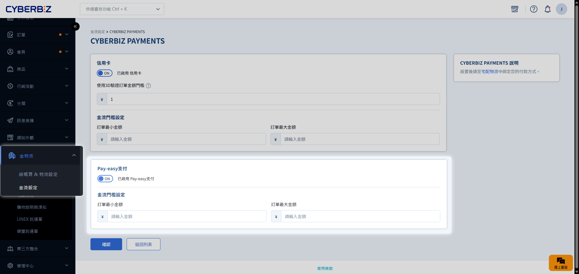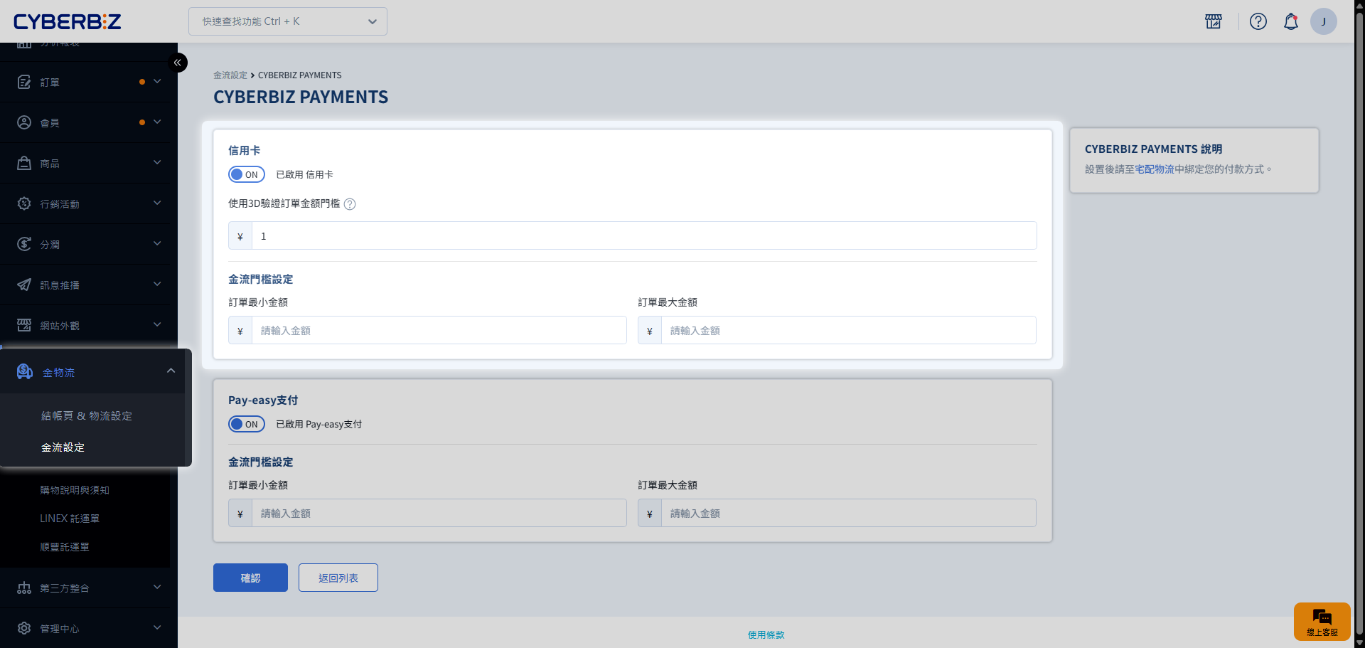 - 可於「付款方式」欄位,綁定該物流適用的金流選項。