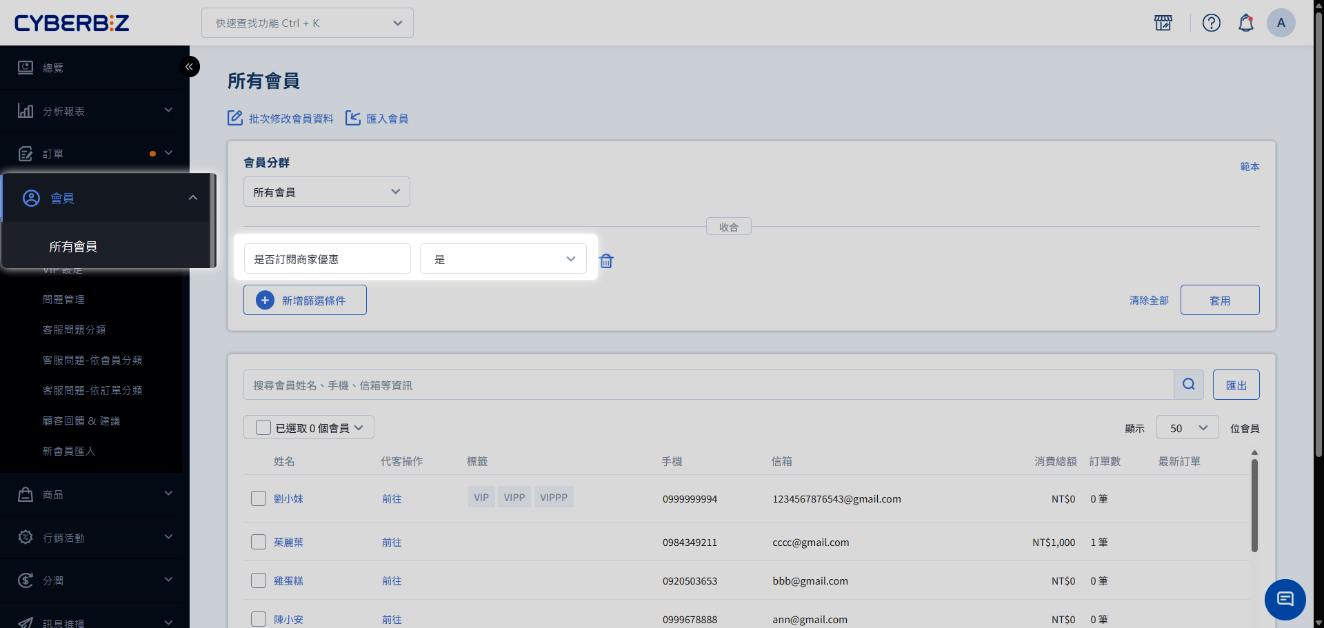 *篩選條件可至 CYBERBIZ 後台「會員」→「所有會員」進行分群設定。
