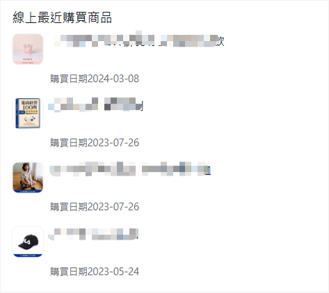 會員於 查詢當日起回推一年內在 EC 最近購買之十筆商品 ( 同樣商品會被認列為同一筆 ),並依據購買日期由近到遠顯示。