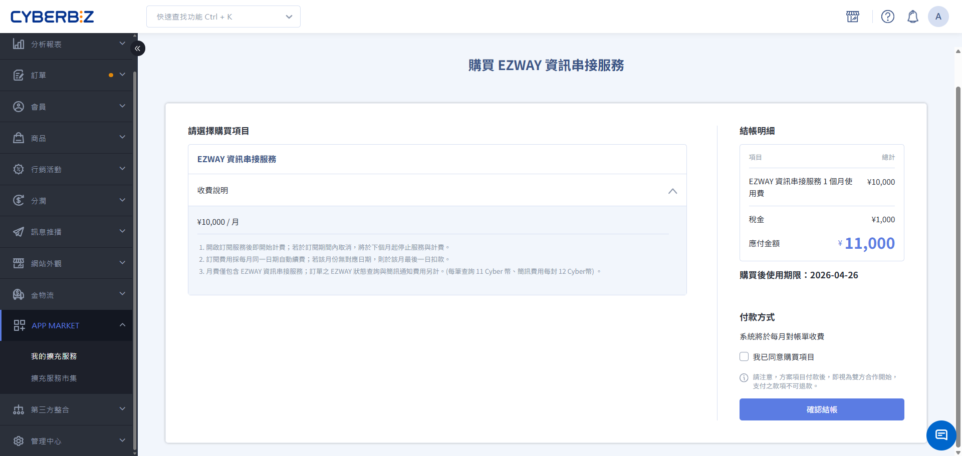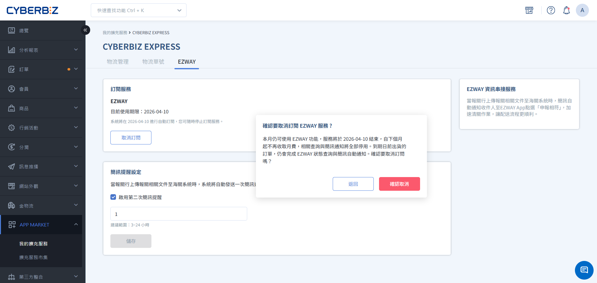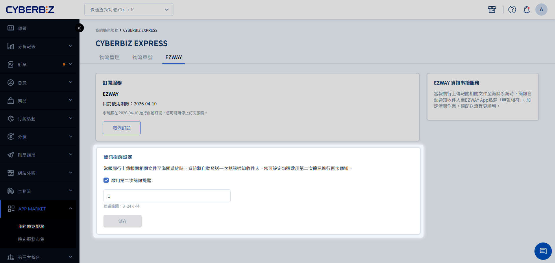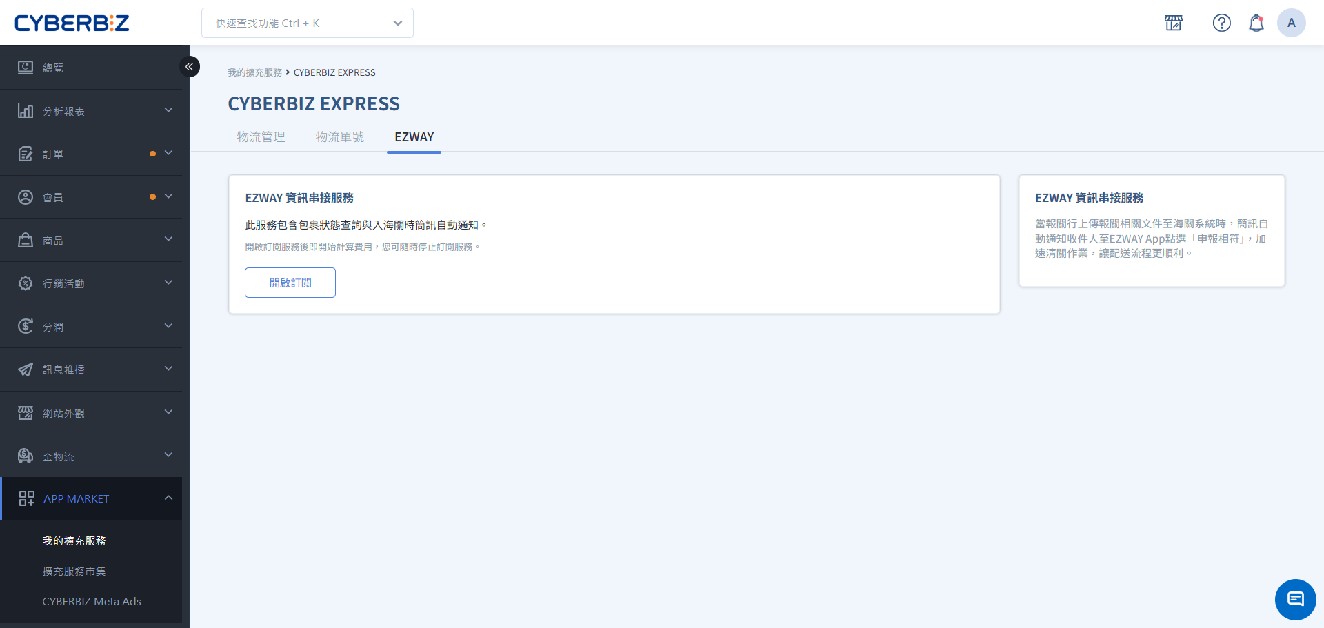 後台路徑 :「APP MARKET」→「我的擴充功能」→「CYBERBIZ EXPRESS」→「EZWAY」頁籤