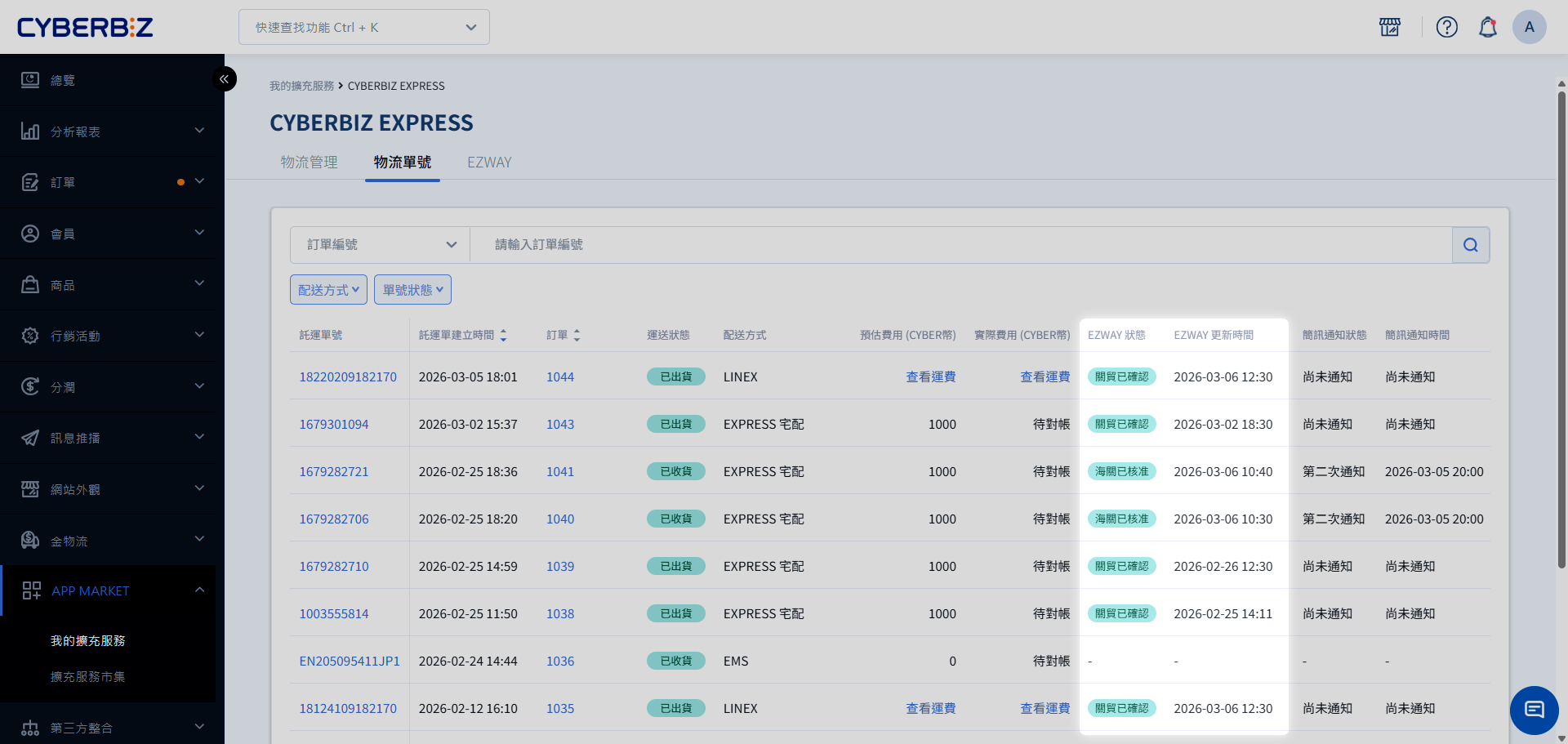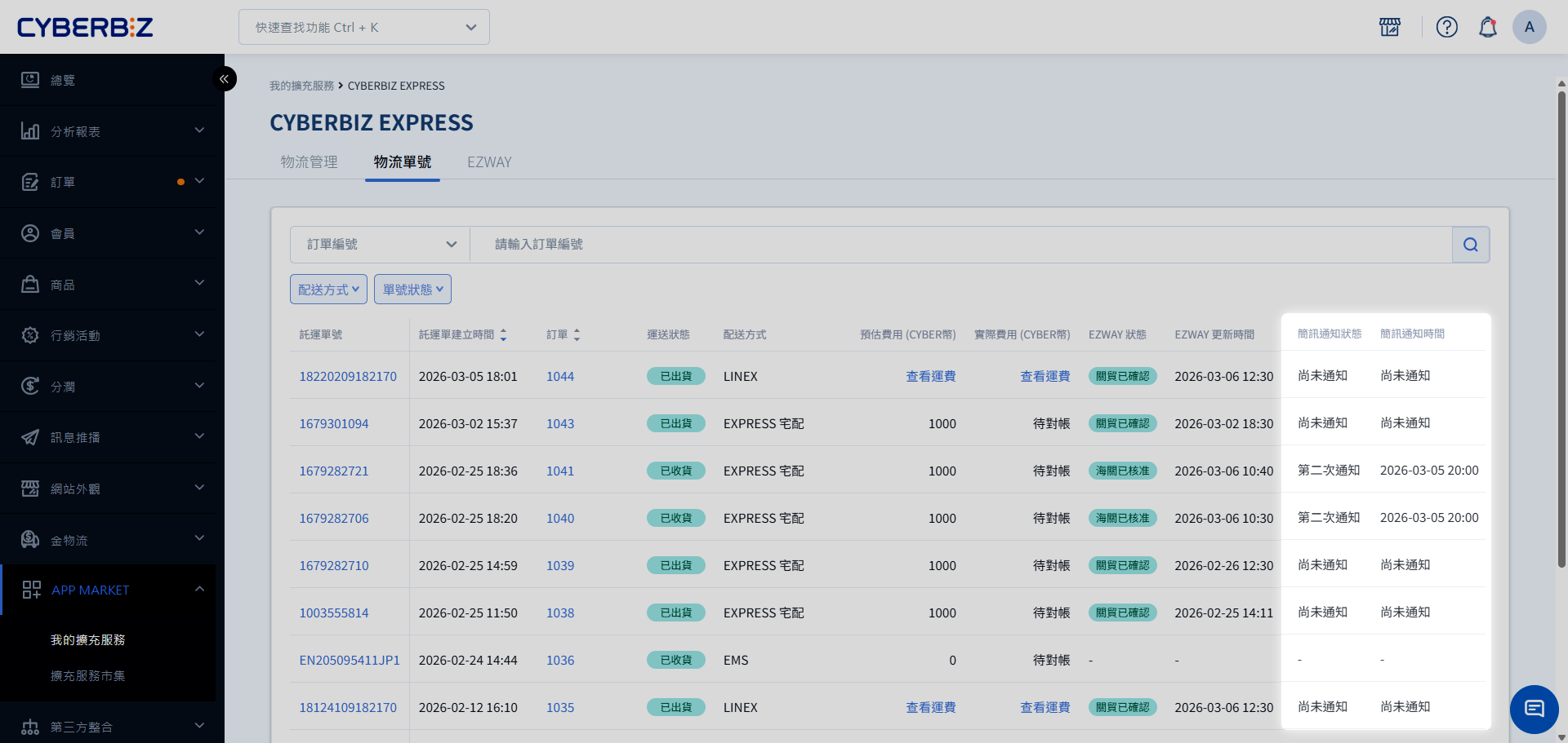 後台路徑 :「APP MARKET」→「我的擴充功能」→「CYBERBIZ EXPRESS」→「物流單號」頁籤