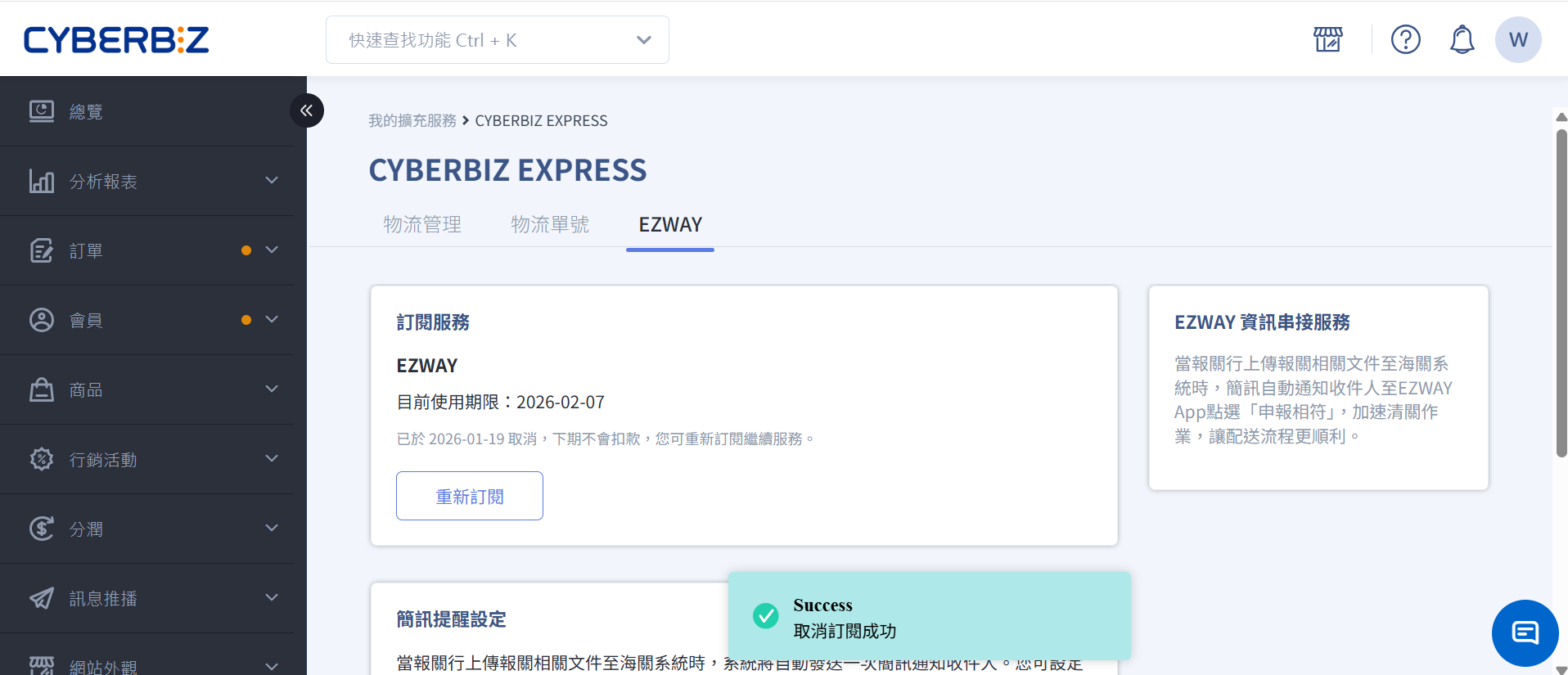 - 服務不中斷:於當期效期內成立之訂單,系統仍會持續執行簡訊通知並同步 EZWAY 申報狀態,直至本期服務結束為止。