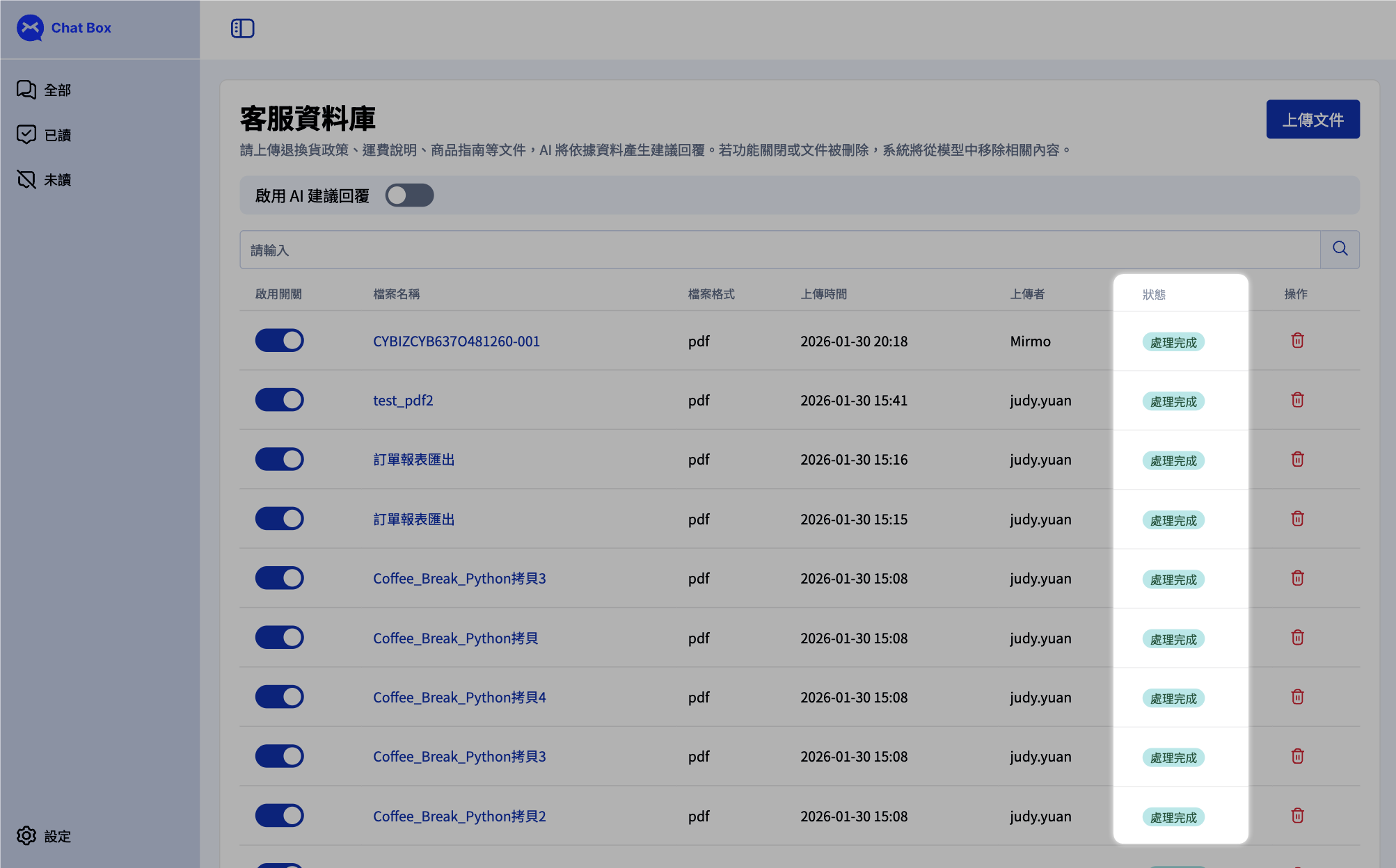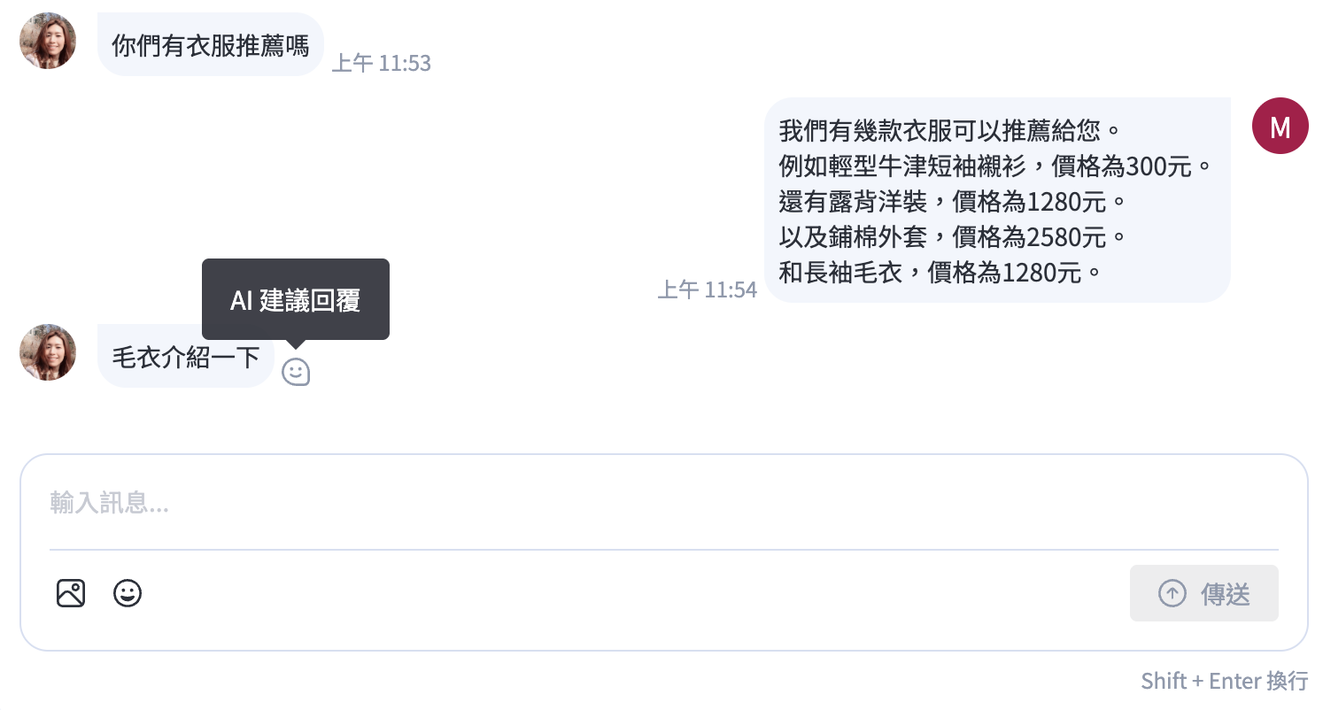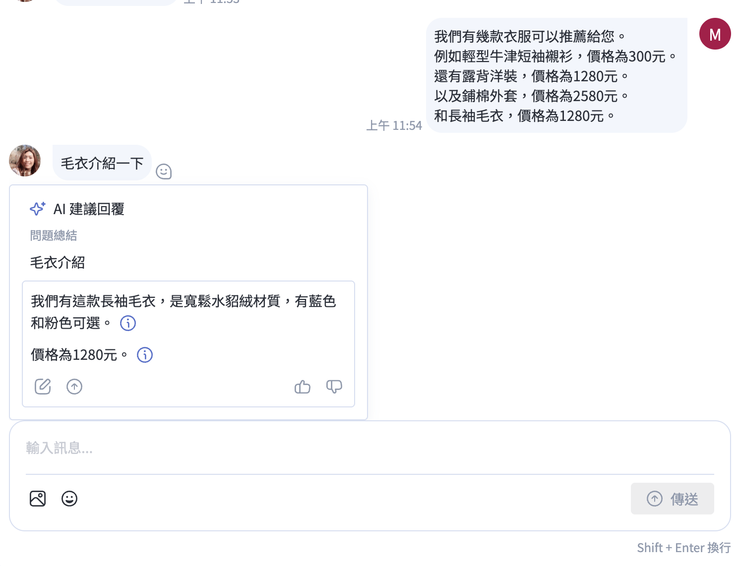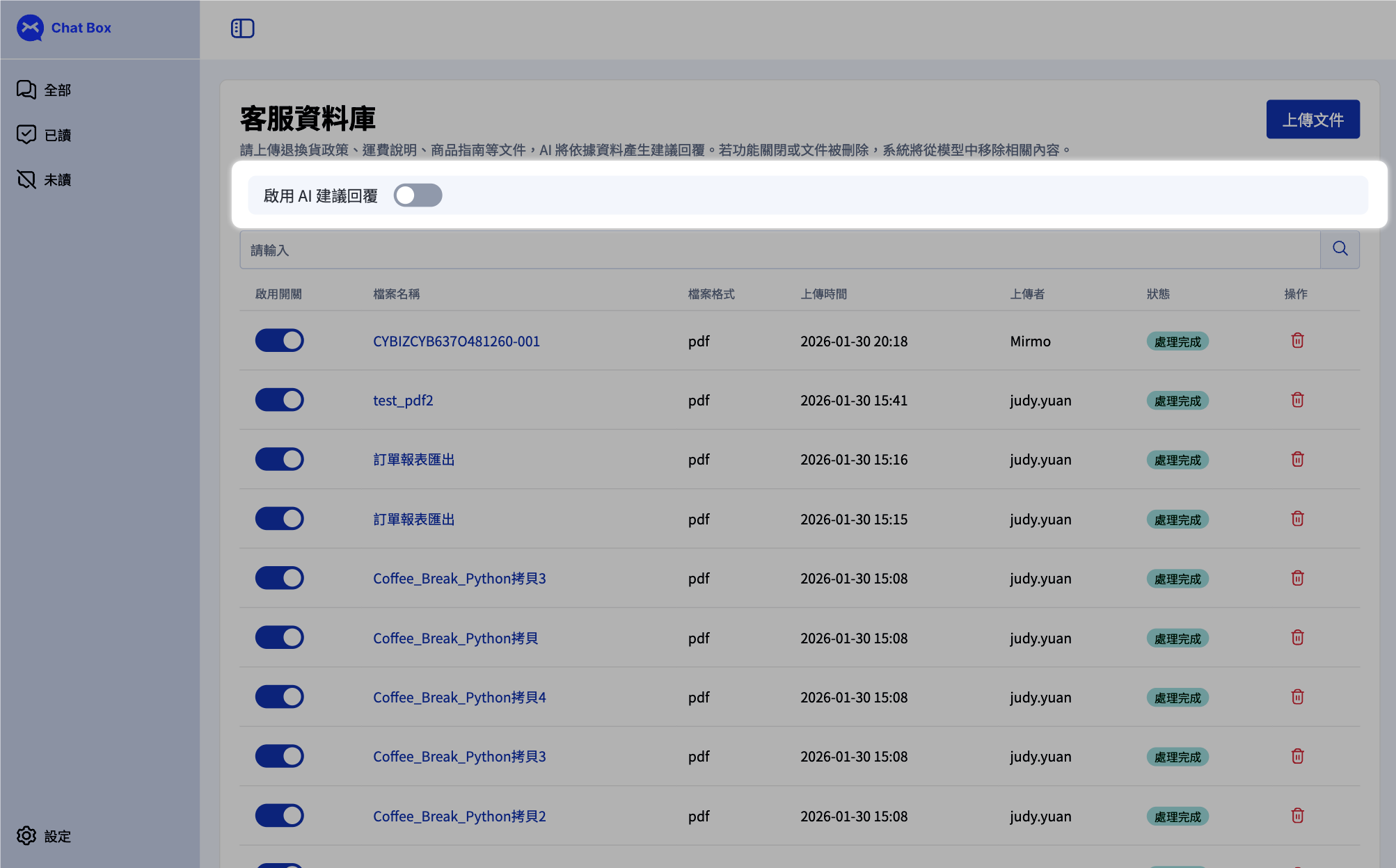- 只要將您的退換貨政策、運費說明、商品指南等文件上傳至「客服資料庫」,AI 助手就會自動學習,並在對話時為您擬定精準的回覆內容。