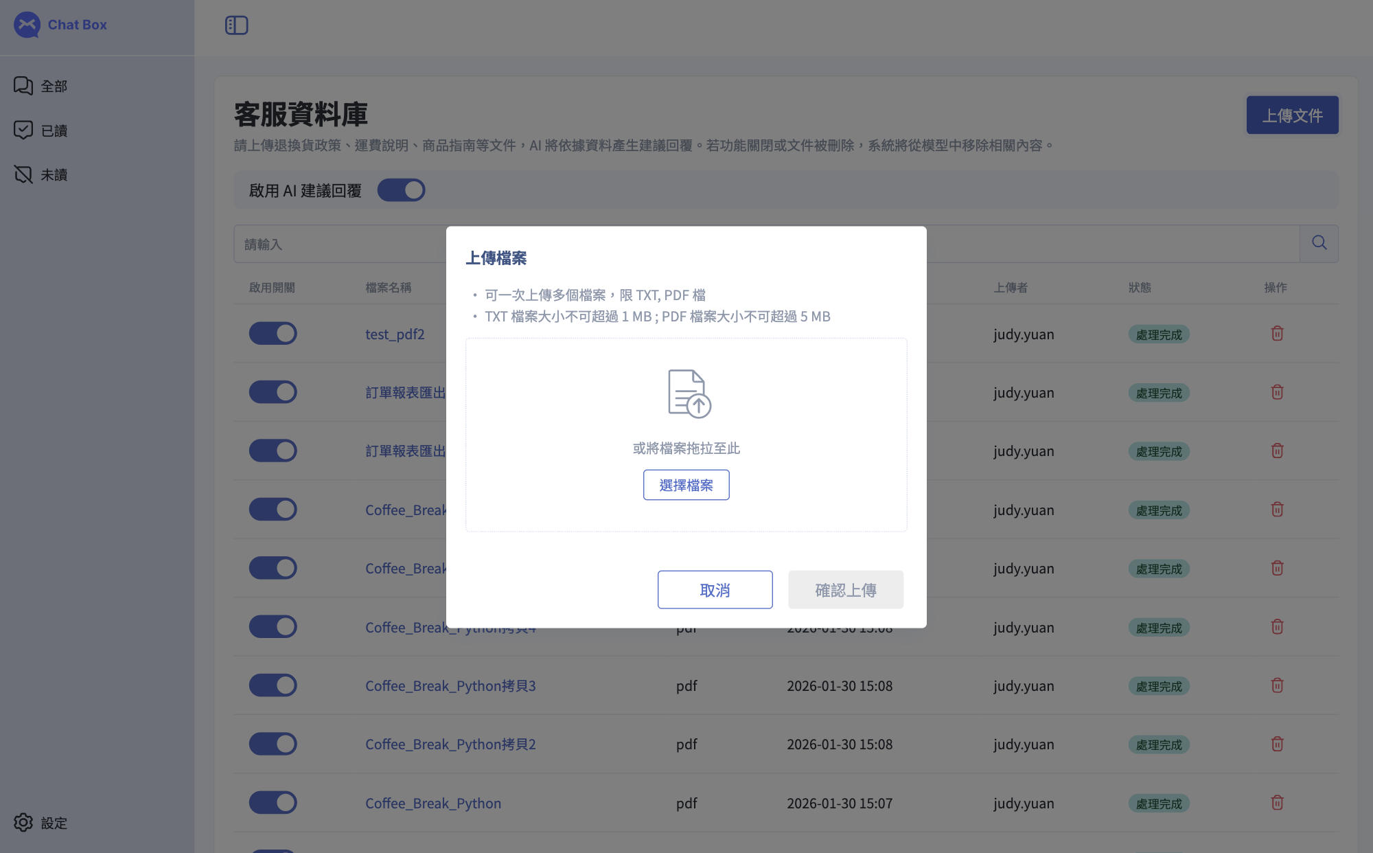 - 資料品質決定回覆品質:上傳的文件描述越詳細(如:常見問題集、內部 SOP),AI 的回覆就越精準。