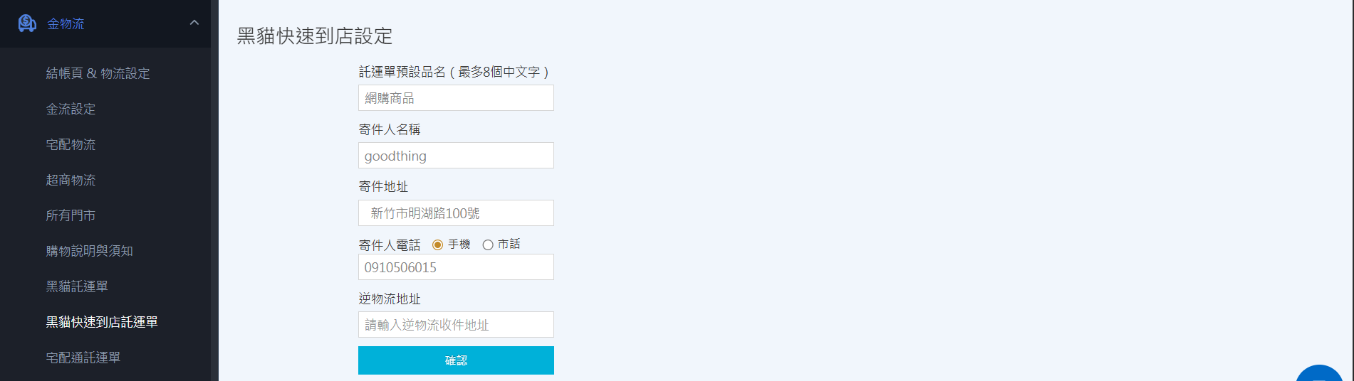 - 請先至「金物流」→「黑貓快速到店託運單」設定出貨地址,若無設定則會導致出貨時顯示「寄件人資訊」不完整的通知。